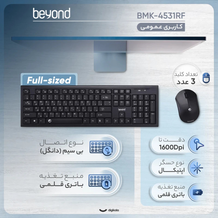 کیبورد و ماوس بیسیم بیاند مدل BMK-4531RF، یک مجموعه کارآمد برای استفاده اداری و خانگی است. این محصول با فرم فولسایز، ۱۰۴ کلید اصلی را ارائه میدهد و با حروف حکشده فارسی، تایپ متنهای فارسی را برای کاربر آسانتر میکند. سوییچهای ممبران در این کیبورد با عمر ضربهپذیری تا هشت میلیون کلیک، صدای کمتری نسبت به کیبوردهای مکانیکال تولید میکنند. پایههای قابل تنظیم و ضدلغزش، امکان تغییر زاویه کیبورد را فراهم کرده و از جابهجایی ناخواسته حین تایپ جلوگیری میکنند. اتصال بیسیم از طریق دانگل USB و فرکانس ۲.۴ گیگاهرتز، بردی در حدود ۱۰ متر را پوشش میدهد و به شما آزادی عمل بیشتری روی میز میدهد. ماوس همراه این مجموعه نیز با حسگر اپتیکال، دقت ۱۲۰۰ DPI و طراحی ارگونومیک، تجربهای راحت را در کنترل نشانگر به ارمغان میآورد. این ماوس ۷۰ گرم وزن دارد و برای تامین انرژی از یک باتری نیم قلمی استفاده میکند که تا پنج میلیون کلیک دوام دارد. راهاندازی این مجموعه به صورت Plug & Play صورت میگیرد و با انواع سیستمعاملها از ویندوز گرفته تا اندروید و iOS سازگار است. اگر بهدنبال مجموعهای بیسیم، سبک و اقتصادی برای کارهای روزمره هستید، BMK-4531RF میتواند پاسخگوی نیازتان باشد.